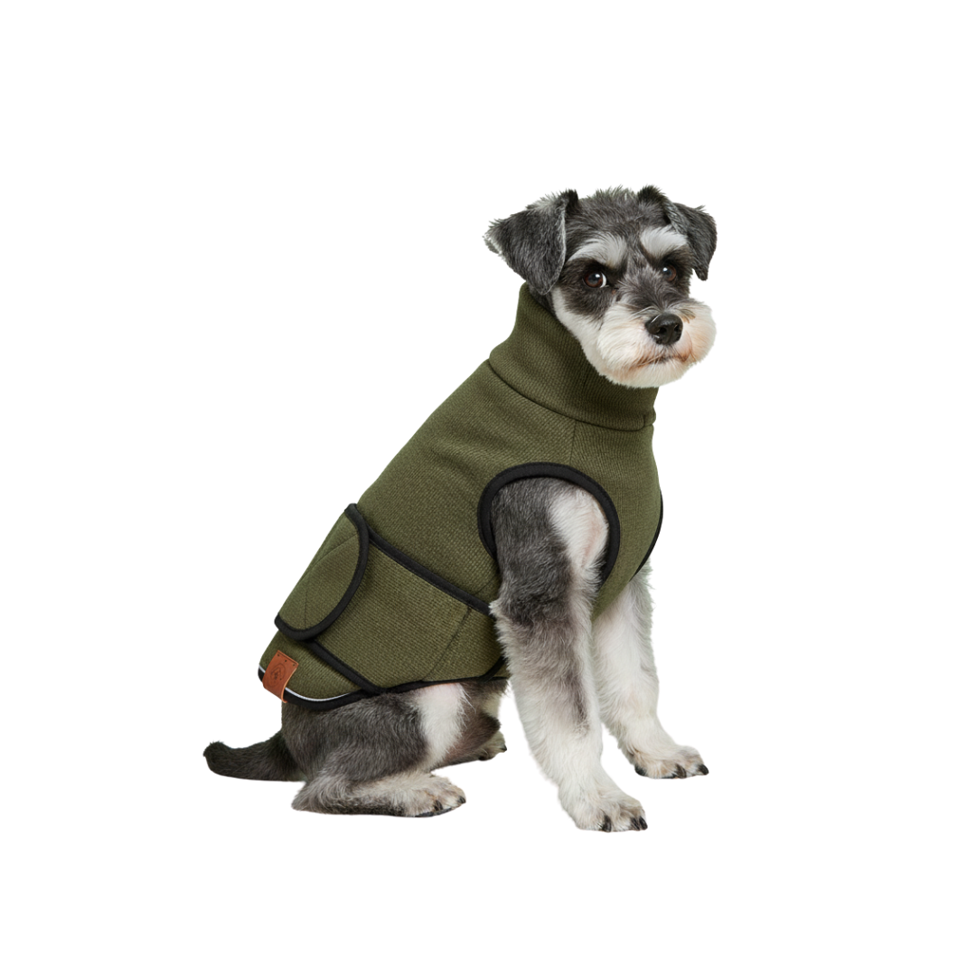 Swaddle Me keeps your pup covered in soft warmth without bulk. The tall fleece turtleneck shields the breeze, while the wraparound belly panel secures with an easy hook-and-loop closure. A textured olive shell, soft lining, and contrast binding bring a clean, utility look that works from quick walks to long park loops.
